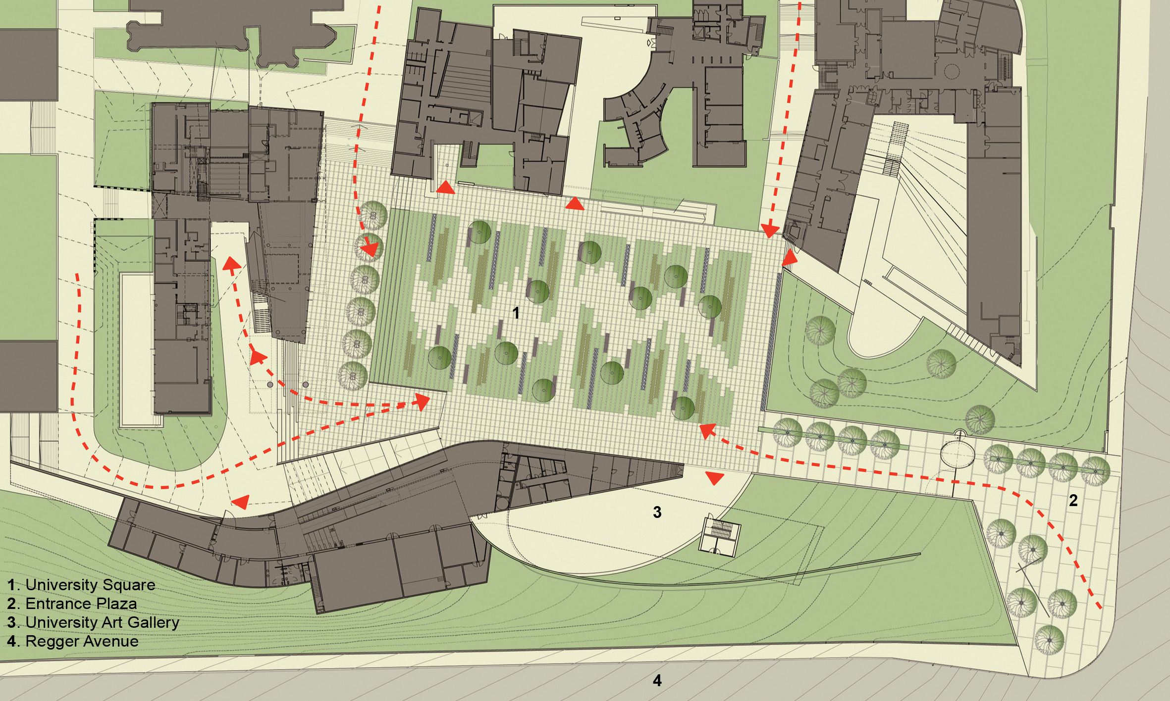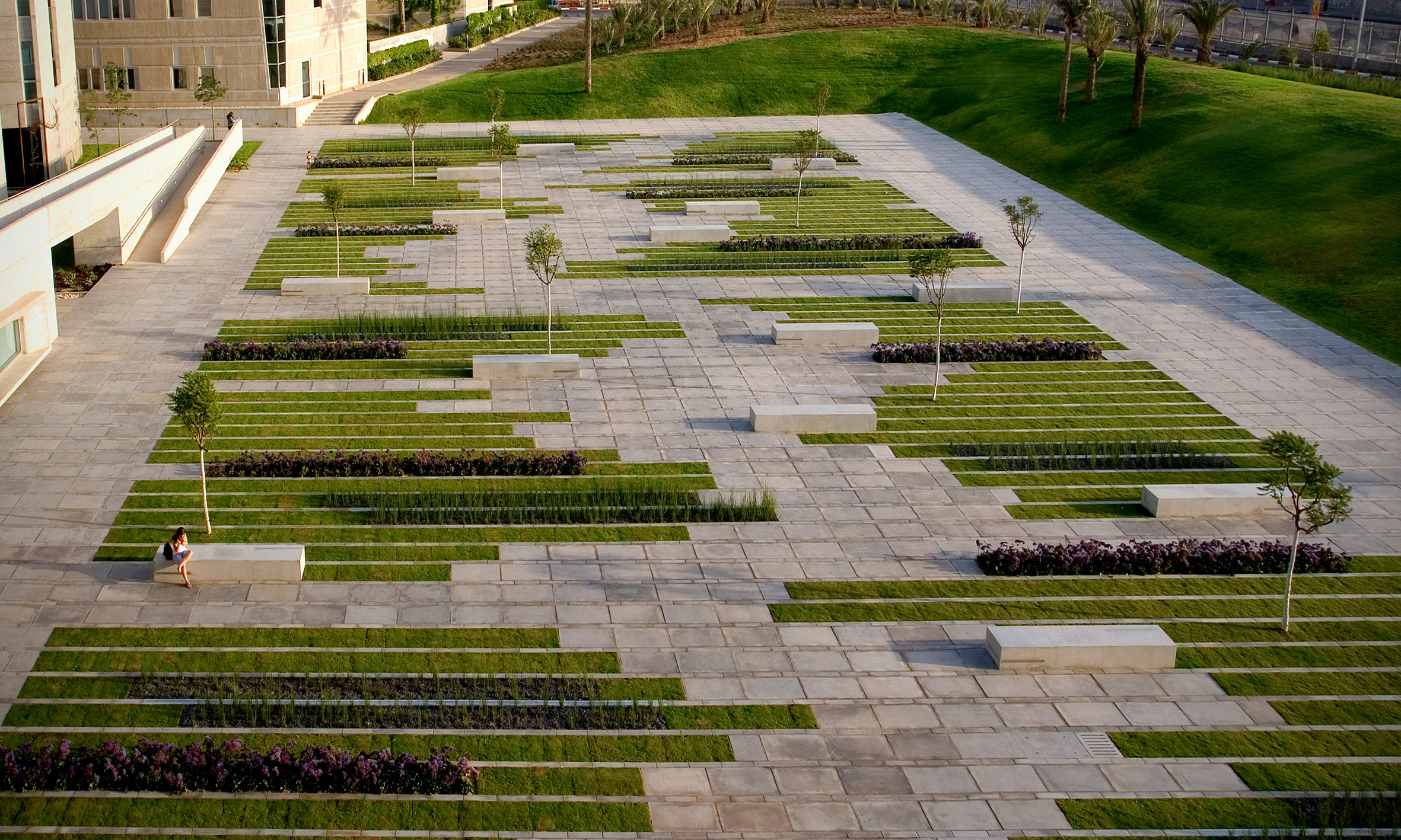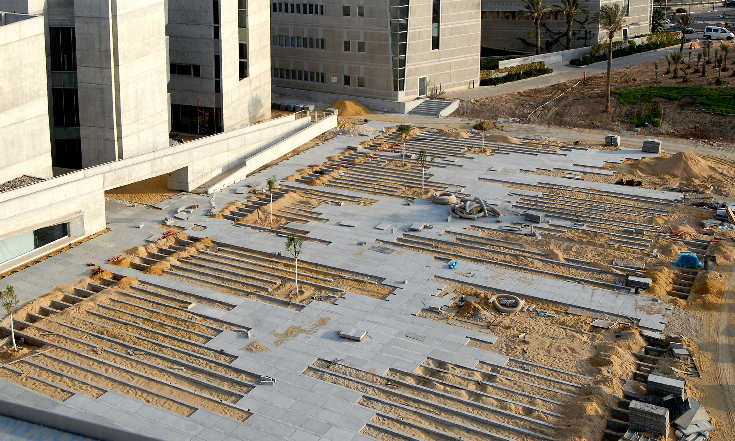 Deichmann Square is designed to create a common area that connects the entrances of all the buildings encompassing it, so that it may serve as an outdoor meeting place for all its users, especially during off-times from studies. Because intensive use is expected to be made of the square, with hourly changes in the make-up of its occupants during intervals between lectures, a solution that uses a limited amount of vegetation has been preferred. This solution is suitable for the desert climate of the Negev, which does not favor vegetation in the hot and dry summer seasons.