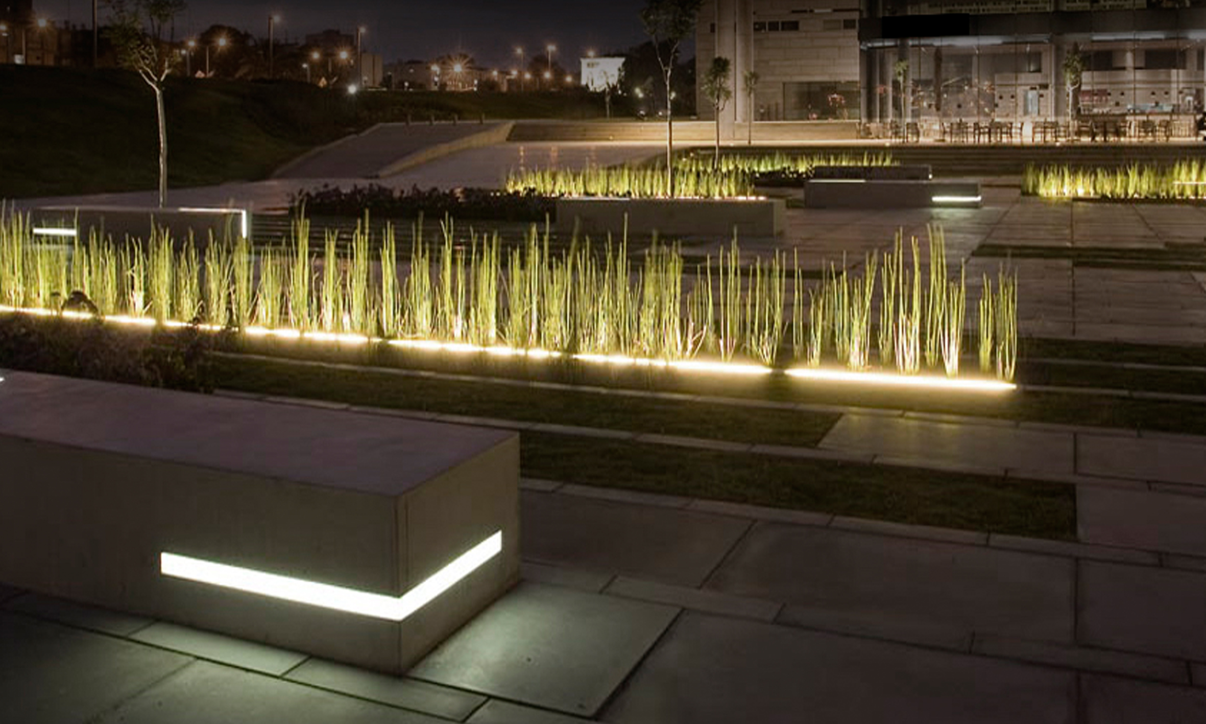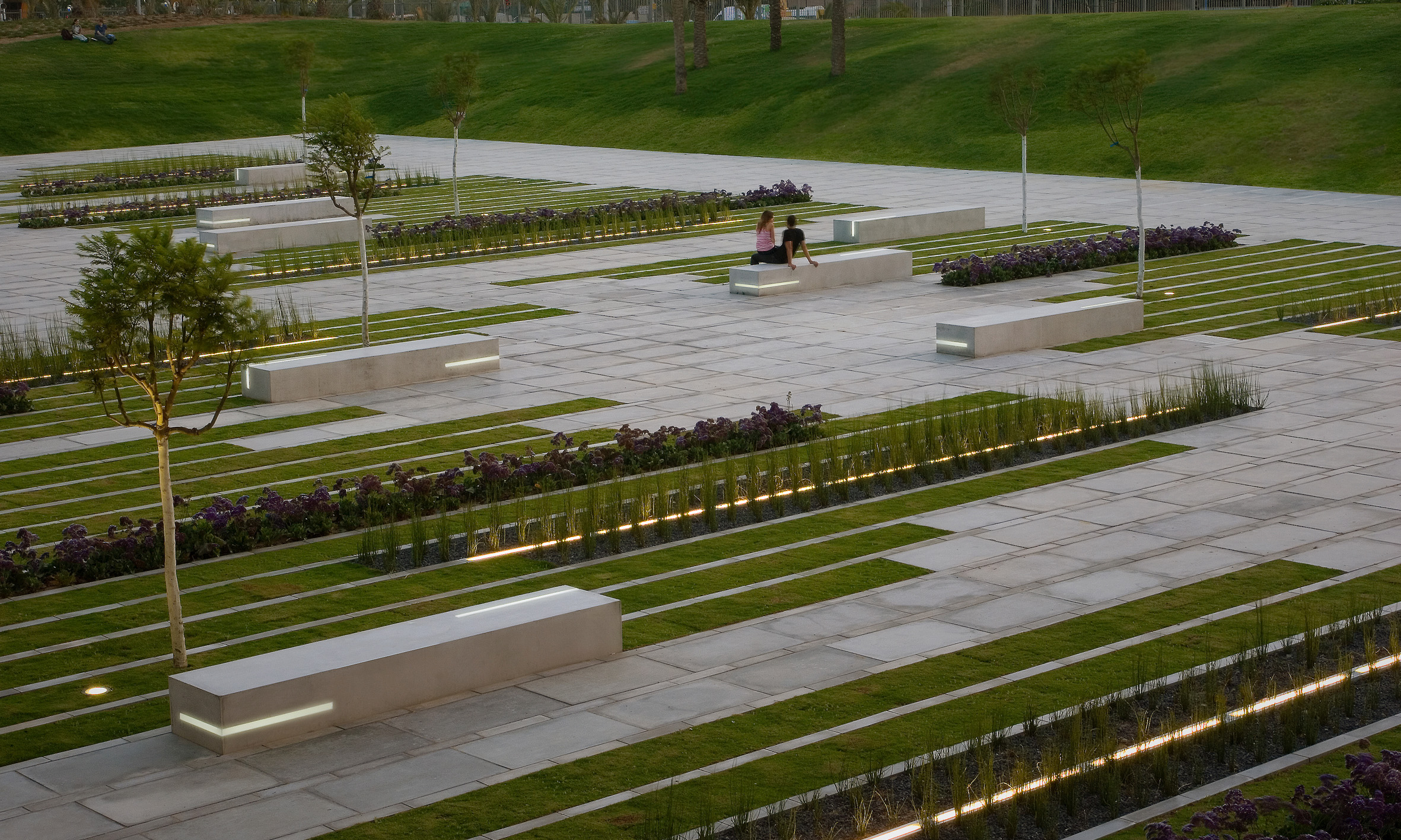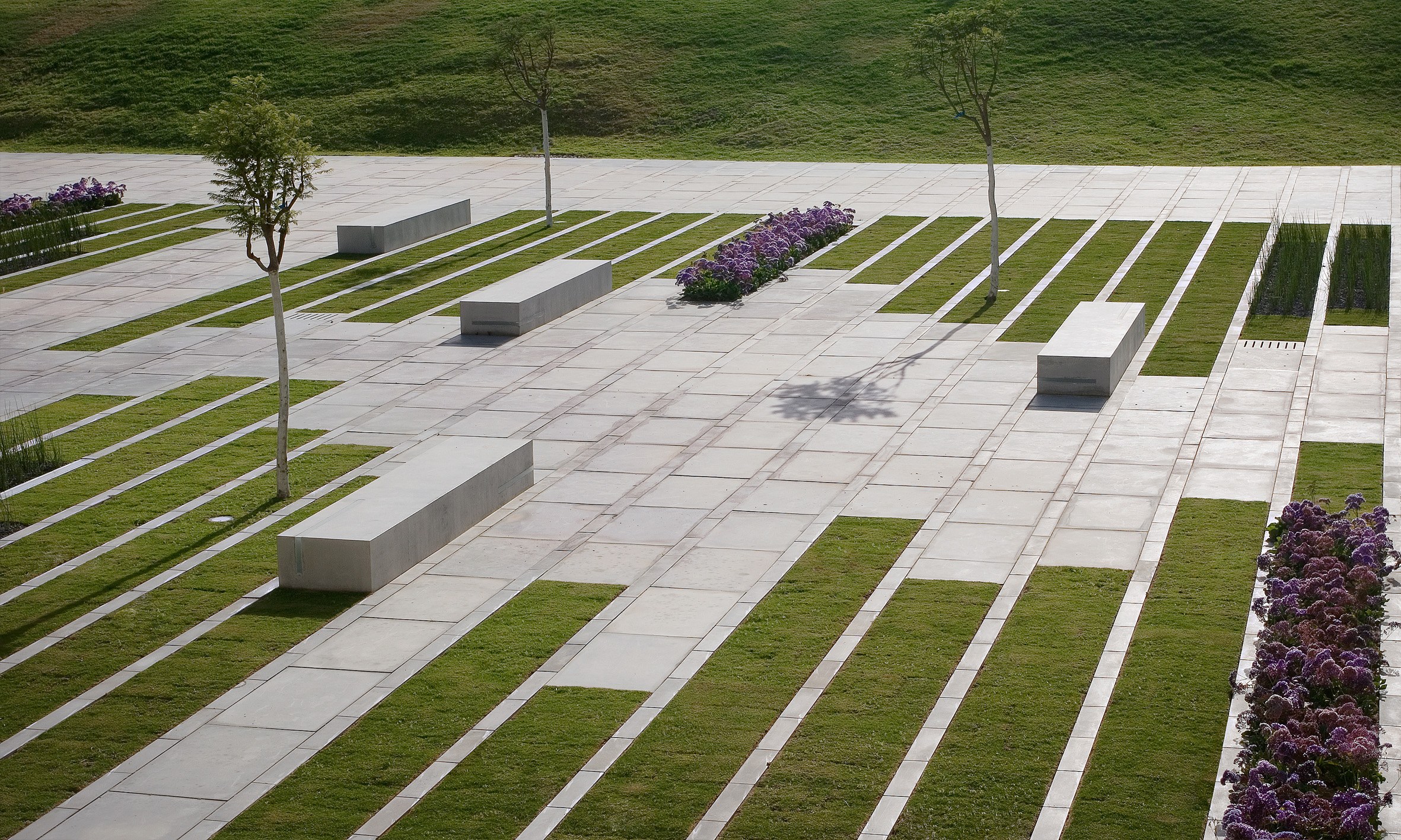 The finishing material of the façades of the existing buildings around the square and of the future Gallery is bare concrete. The choice to pave the square with panels also made of bare concrete is designed to unify the square and the buildings around it into a single visual entity. The oblong square has been planned as a carpet of lateral strips. Each strip is 90 cm wide, and contains a strip of 75x125 cm concrete panels and a 15 cm strip that contains alternating fills of paving tiles, lawn, bushes, flowers, and lighting strips. Sitting areas, each consisting of a 75 cm-wide bench shaded by trees, are scattered randomly through the square. The tree chosen for the square is the jacaranda, which has a lilac flower and is suitable to the Negev climate. Equisetophyta have been used to bound the sitting areas. Some of the fill strips have been planted with beds of geophytes and of seasonal flowers that will be changed every three to four months, so that the floral coloring will change with the seasons. The lighting of the square at night comes from the lighting of the buildings around its perimeter, from lighting strips sunken in the tiles, and from lighting strips inlaid in the benches.