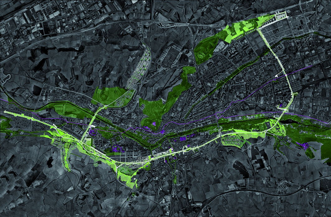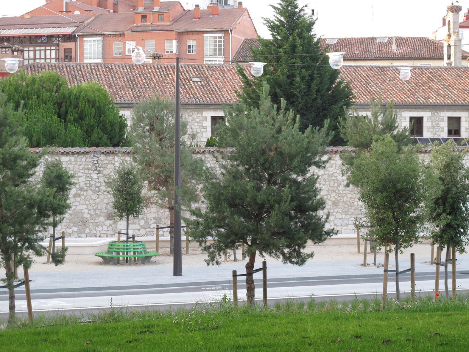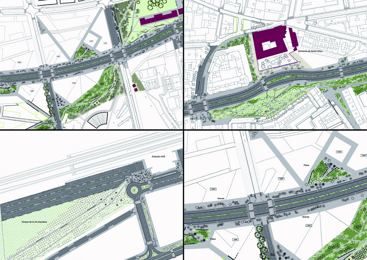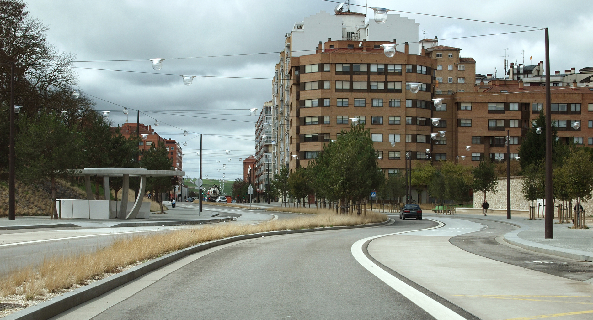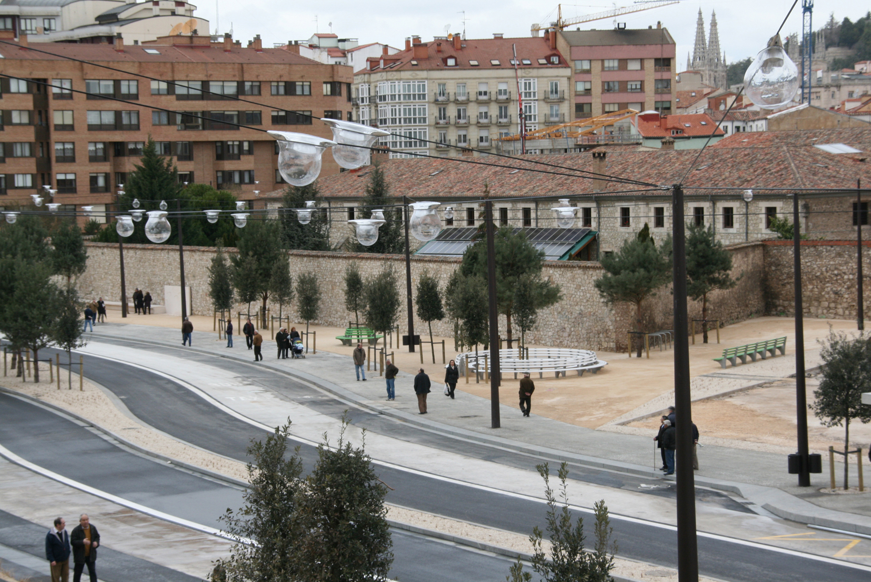 El encargo consistia en recalificar las antiguas vias ferreas desafectadas de Burgos por unas nuevas urbanizaciones organizadas alrededor de un bulevar. Herzog & de Meuron imaginaron nucleos de intensidad separados por vacios, deslizandose en la ciudad. La propuesta adquiere una calidad ligada a la geografia « artificial » del lugar. Este paisaje de infrastructuras ofrece una cierta forma de naturaleza. Por sus dimensiones y su trazado, estructura el territorio del mismo modo que lo hacen las laderas boscosas o el rio. Los espacios publicos concebidos acompañan o bordean generosamente el bulevar, pero tambien vastos territorios. Se trata de una estructura compleja que se adapta a la topografia y a las formas urbanas. Es un paisaje potente por su presencia pero sutil en la manera en la que respecta y revela los componentes territoriales. Dos escalas de intervencion coexisten : la gran escala de los bosques y los parques y la pequeña escala de las aceras, las plazas y los jardines.