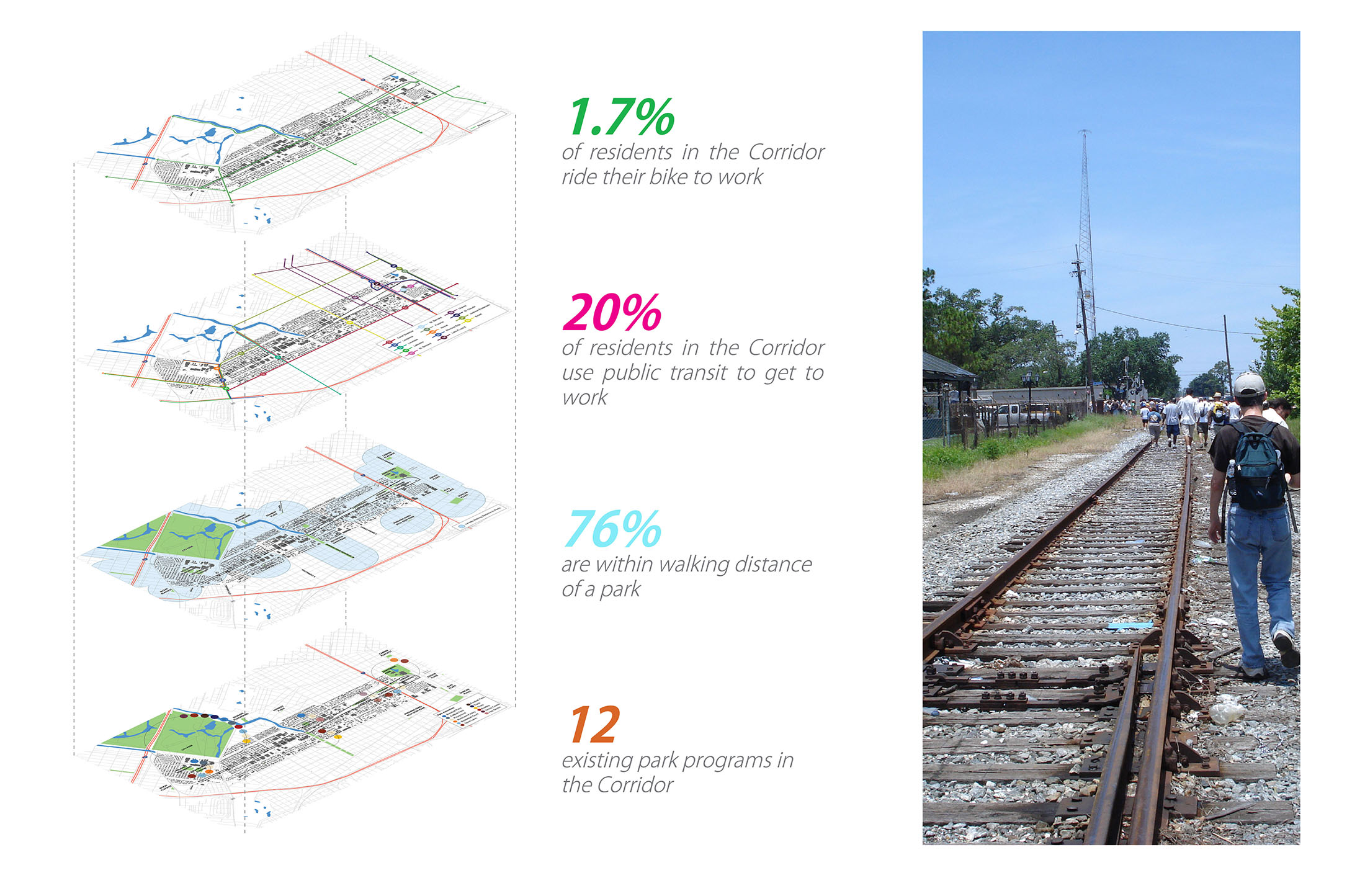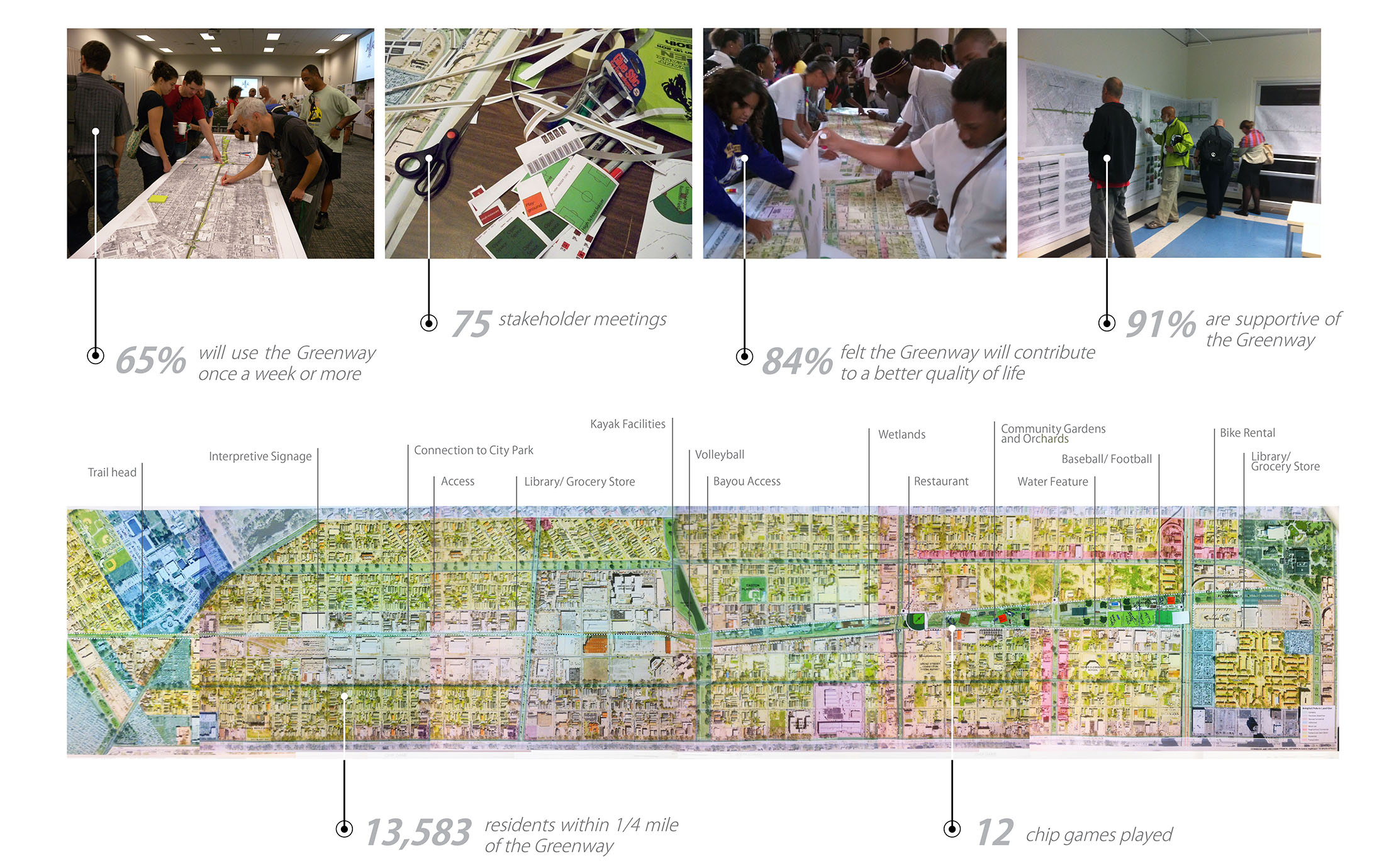 The Lafitte Corridor comprises nine vastly different neighborhoods with a spectrum of socioeconomic conditions and racial compositions, creating a challenging context for community engagement. The overall planning strategy involved convening dual meetings at a series of three public events in order to capture the entire study area allowing the community to feel comfortable attending events near their homes. More than 75 stakeholder meetings among community leaders, elected officials and neighborhood organizations were held as part of a strategy of listening to the community and designing a plan that was truly supported by the final users of the Greenway.