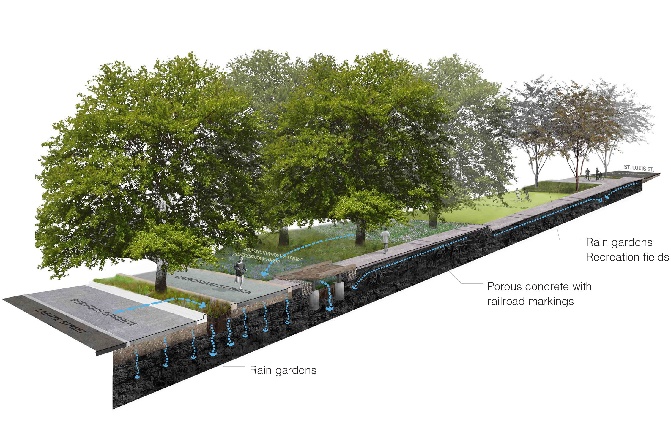 The overall Greenway design concept draws upon principles of historic ecology and builds upon the rich layers of the site’s history. Prior to urbanization, New Orleans was covered by a Cypress tree forest and swampland. Restoring the site’s ecology to bottomland hardwood forest and native plantings was integral to repairing the barren landscape.