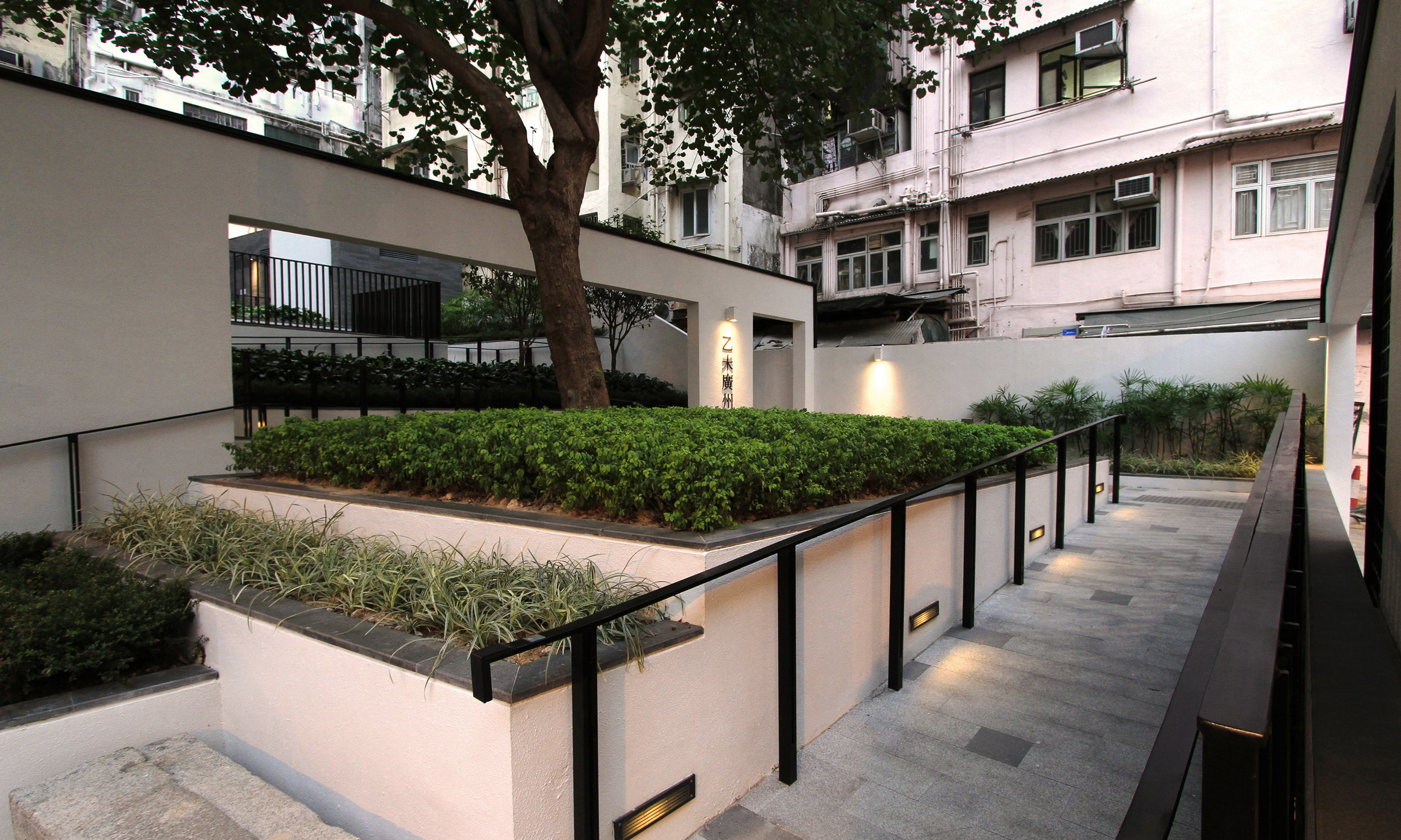 One of the biggest challenges was to solve and to enhance the enclosed site character. In order to create a larger spatial experience, a decision is made to design a framed environment with several garden rooms and extended walking experience, instead of an open environment. Therefore, feature partition walls work as the elements to retrace the footprints of the site, and to reinforce the spatial relationship with the surrounding and the Park itself. The heavy design language is inspired by the significant background of the site, and is demonstrated in the railings, walls and pavilion, to create a weighty and secrete feeling to the visitors. At the same time, the planting and paving design are straightforward and clean to balance the overall atmosphere, and to unify the divided rooms.