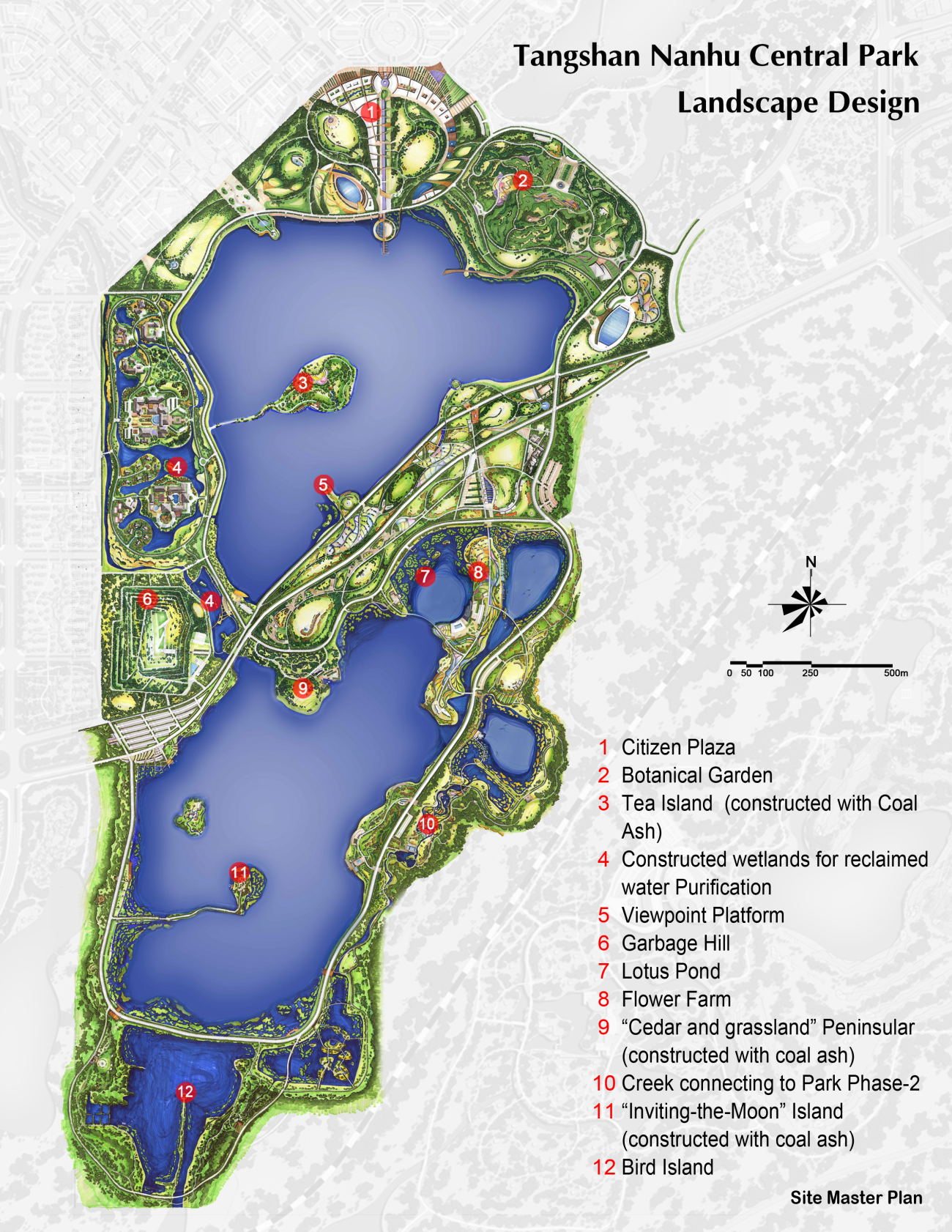 Tangshan Nanhu Eco-city is located 1 km south of the center of Tangshan City. The total area of the Eco-city is 105 km2, with a core area of 38.5 km2, and the Central Park within the core area is 630 ha.