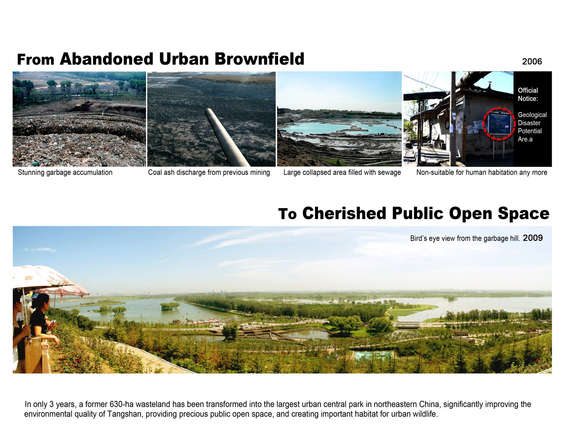 In 1976, Tangshan suffered a 7.8 magnitude earthquake, a large area mined out space collapsed and subsided. By 2006, the subsidence area had grown to 28 km2. Nanhu area became a typical urban brownfield filled with urban and industrial waste, as well as domestic sewage.