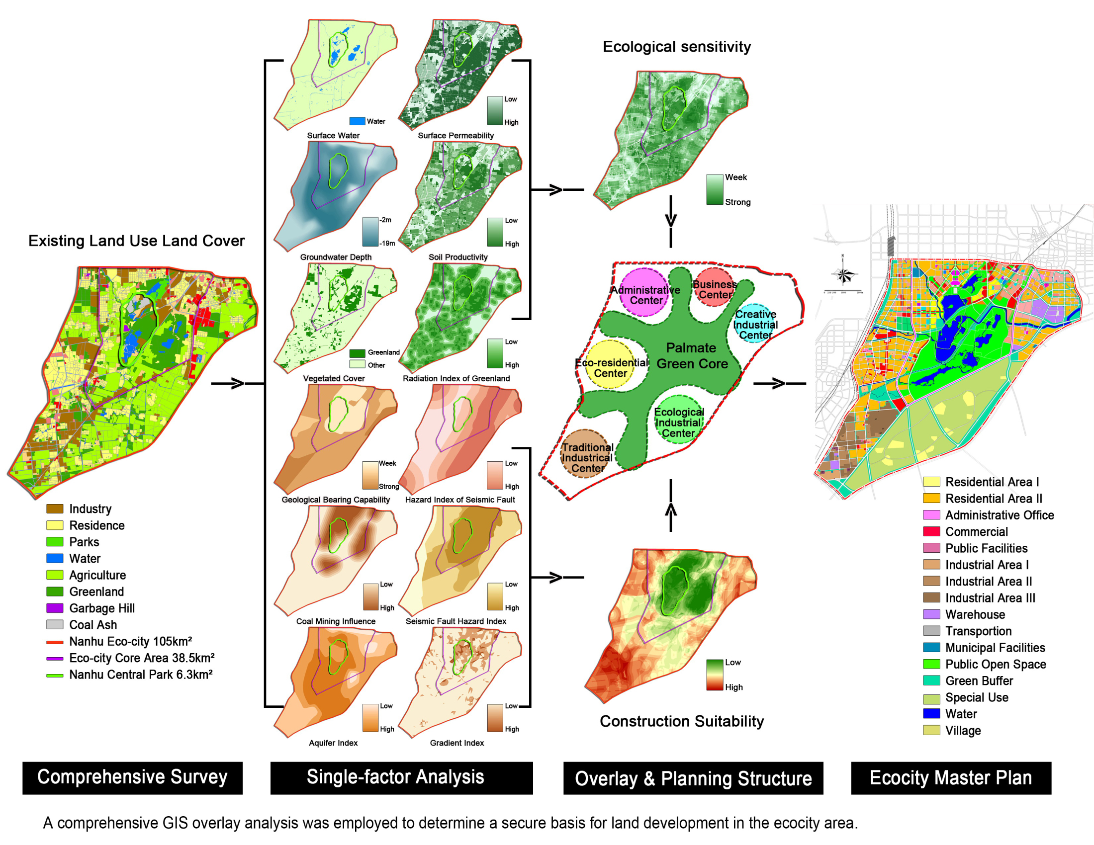 In August 2008, based on the analysis and research regarding the geological structure and potential risk of continued coal mining subsidence in Nanhu, designers started a series of research and planning studies: utilizing Geographical Information System (GIS) for the analysis of the status of land use, collecting eco-factors, evaluating land eco-sensitivity and construction suitability, and determining an appropriate and secure basis for land development.