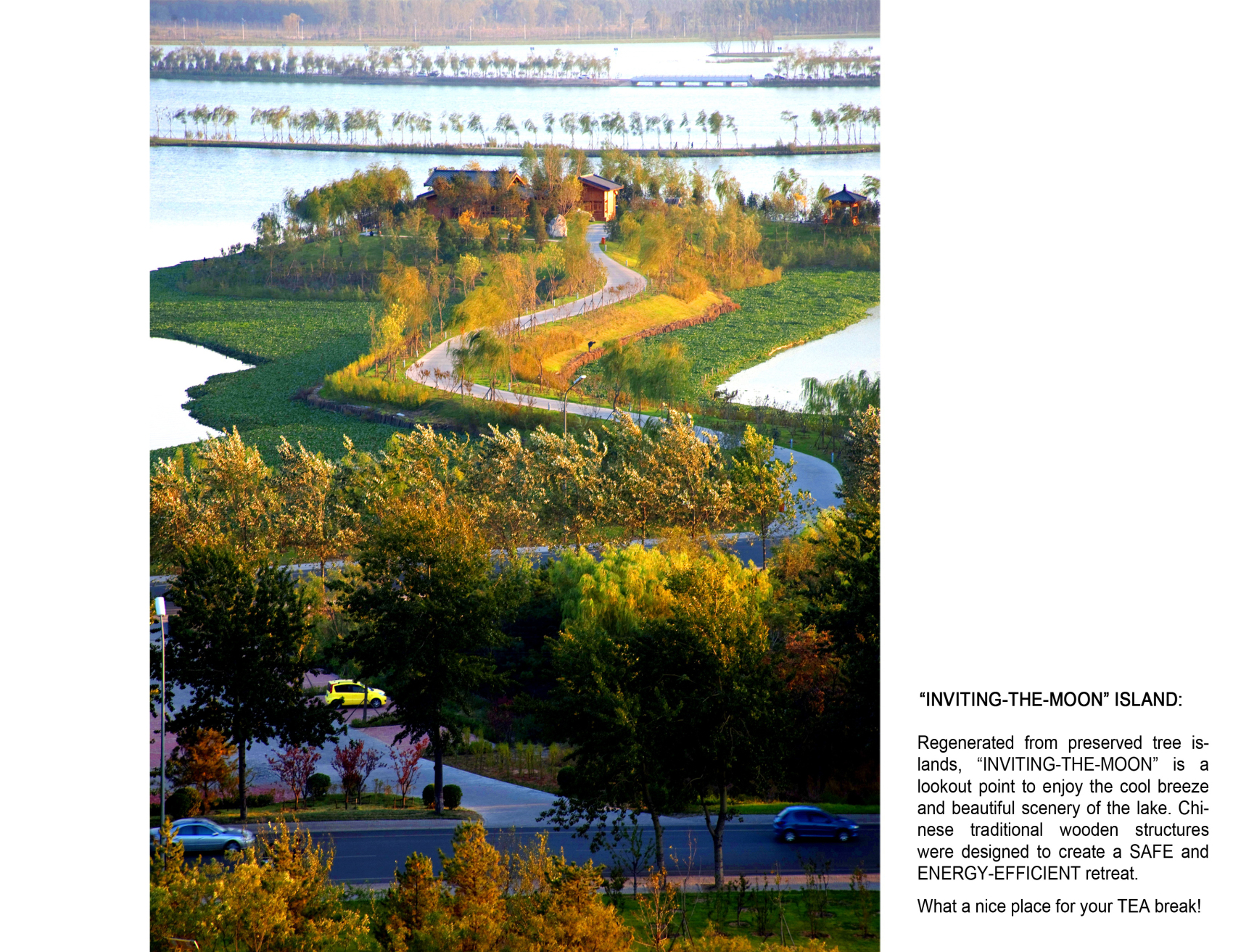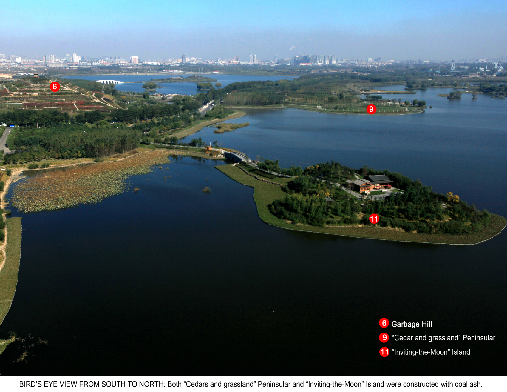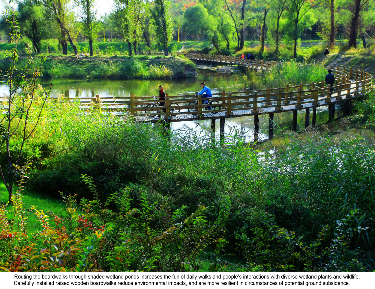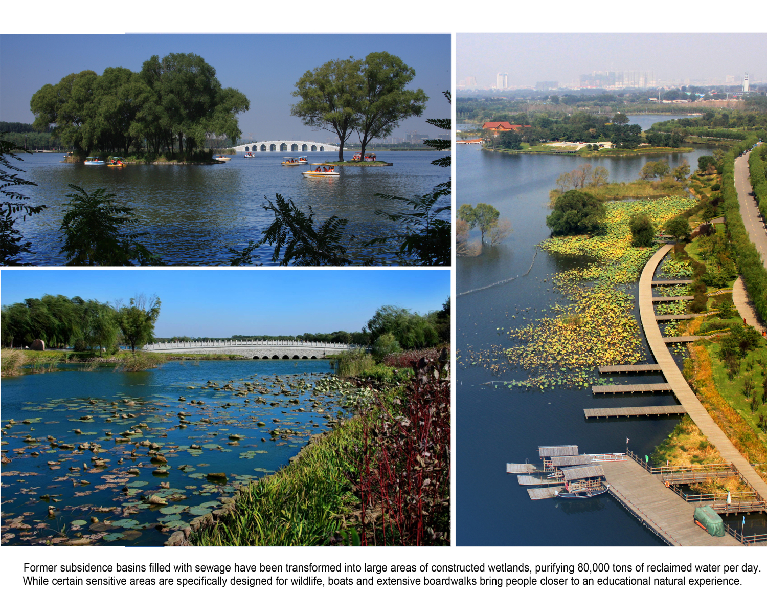 A 270 ha lake has been formed through excavating, dredging and integrating the existing fish fond and subsidence tunnel. Large area wetland landscape was designed to purify the reclaimed water thoroughly, creating unique wetland scenery also as a science and education base. There were over 160 types of plants used in the park to form a diversity of ideal habitats. Existing plants in the park has been preserved maximally, while dominant plant species was taking precedence in plant selection. Light timber framed buildings were built in consideration of limited ground bearing capability, traditional Chinese culture, resource and energy consumption, and environmental effects on the park.