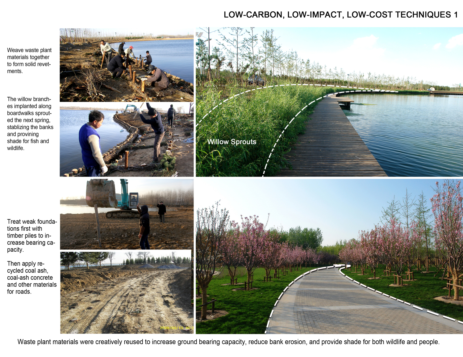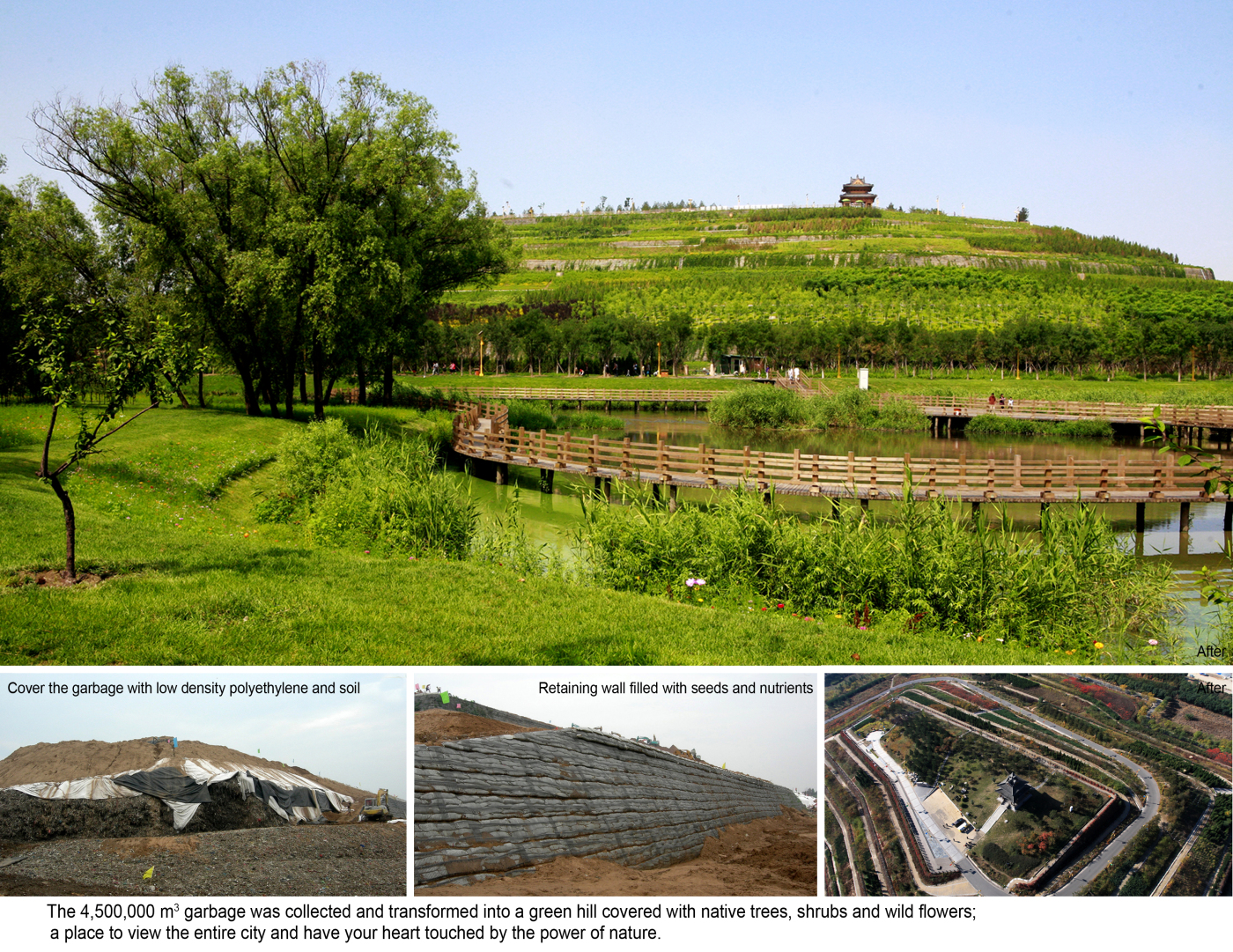 Additionally, a series of ecological techniques of "low carbon, low impact and low cost" have been performed regarding existing severe problems, such as rubbish hill, coal ash, soft foundation and water loss and soil erosion.