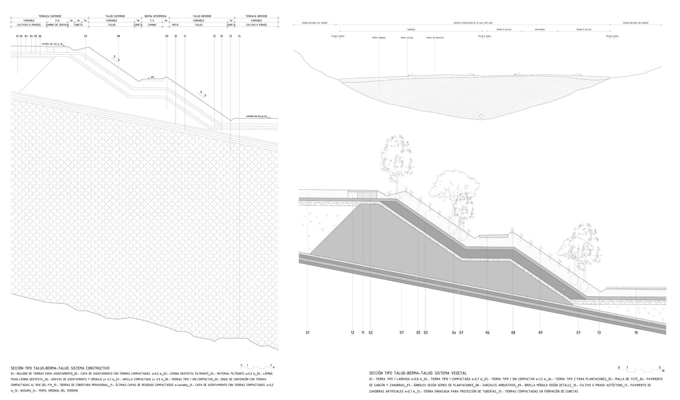 Soil: The determining element in farming is the soil. The new earth was imported over two periods. The first served to build the basic structure of terraces and fill in the space between the retaining walls. The second was used to form a layer of fertile land for the introduction of vegetation. Between the two were laid layers of sand, geotextile, waterproof lining and a second layer of sand to separate the waste dump from new soil. The heterogeneous, inert soil had to be made fertile and suitable for planting with a crop that would grow down into the layers formed by the passage of machinery, removing stones and breaking up the terrain to make it uniform and produce the finished profile. Then manure was applied to specific planted areas (slopes and rows of trees) and plant compost to the terraces to improve the structure and texture of the soil. Crop rotation based on leguminous plants was also established on the terraces in order to improve soil fertility