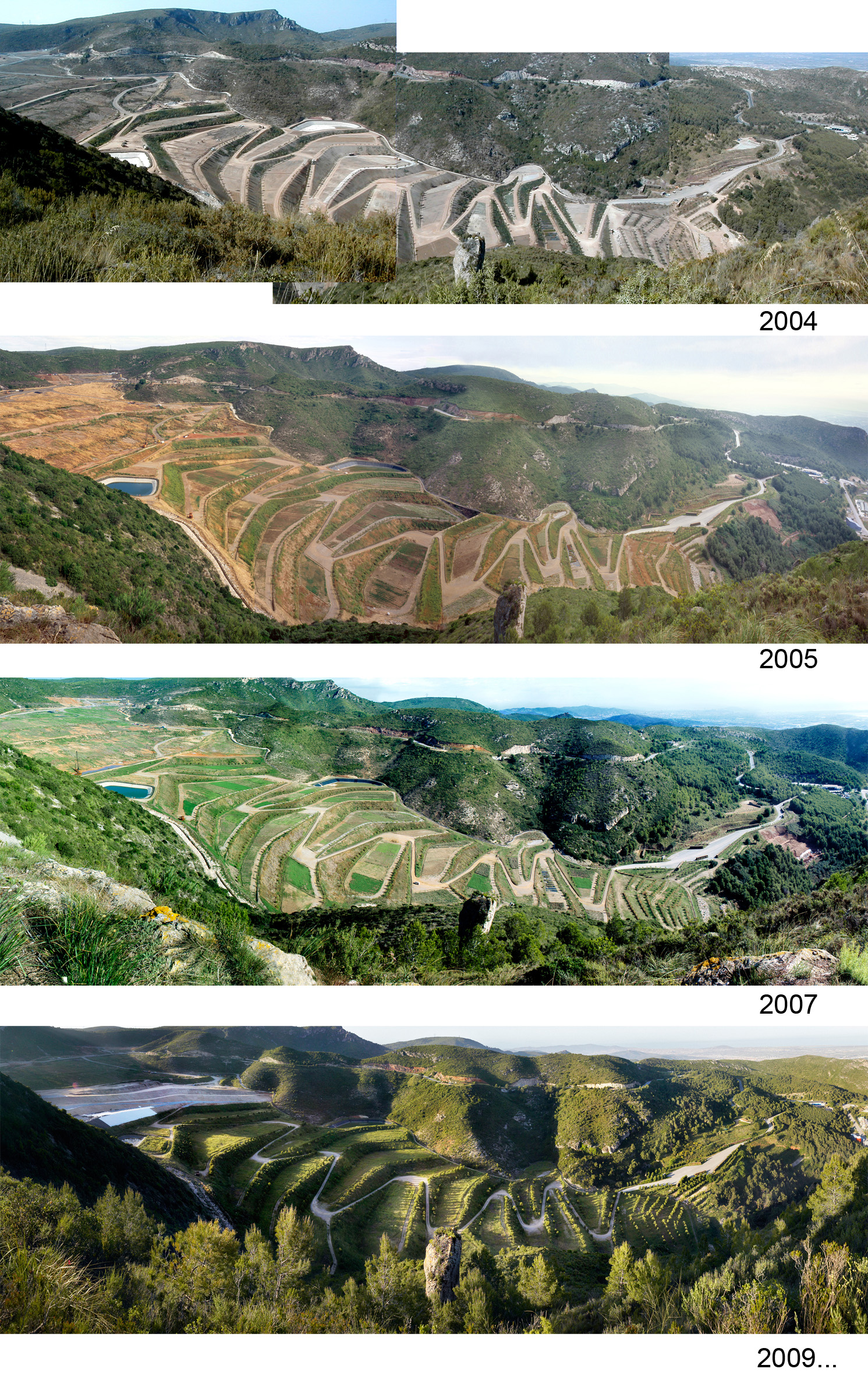 The Vall d’en Joan waste dump was opened in 1974 in a valley in the limestone massif of El Garraf, in the natural park of the same name. Infilling began at the lowest point. Shrubs and trees were eliminated, the site was waterproofed with clayey soils, a drainage system was installed for the leachates and work began on the superposition of layers of waste matter, alternating with shallow layers of earth. As the bottom of the valley was filled in, the waterproofing was extended. The landfill now occupies 70 hectares with a depth of waste matter of over 80 metres at some points. At the start of the restoration project, a layer of earth covered the latest deposit of refuse. A large concrete ditch separates virgin land from the operational waste dump and channels drain runoff from the mountainside. Semi-clean waters and runoff water from the working area accumulate in a reservoir, where they are treated. The restoration process began at the lowest levels while the waste tip was still in use higher up. A new and completely different system was superposed on the existing one, and the two will coexist until the dump is closed. Restoration will only be complete three