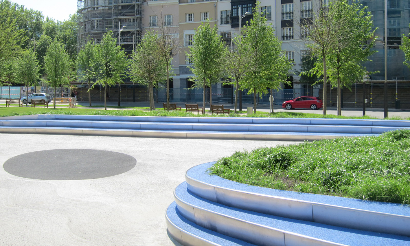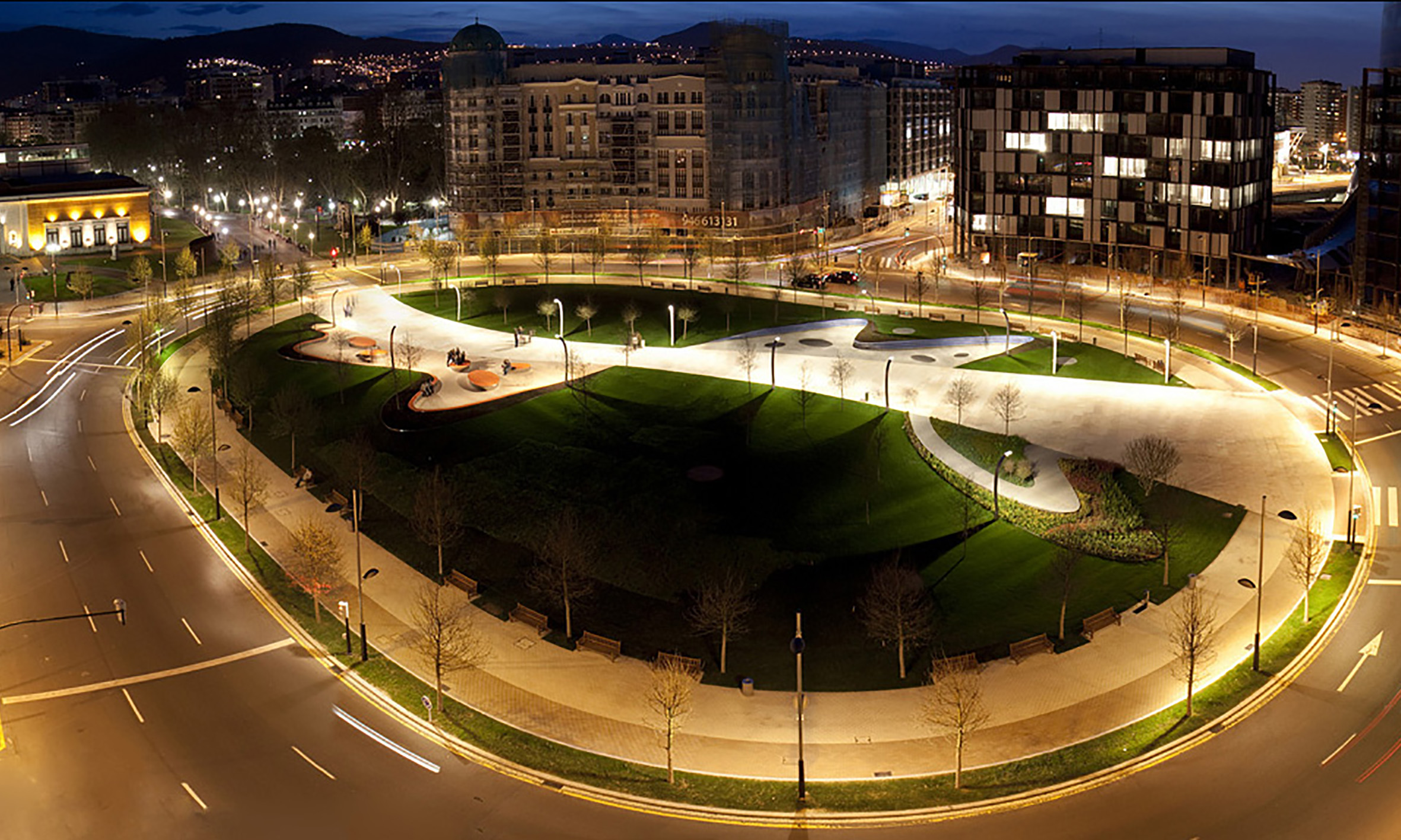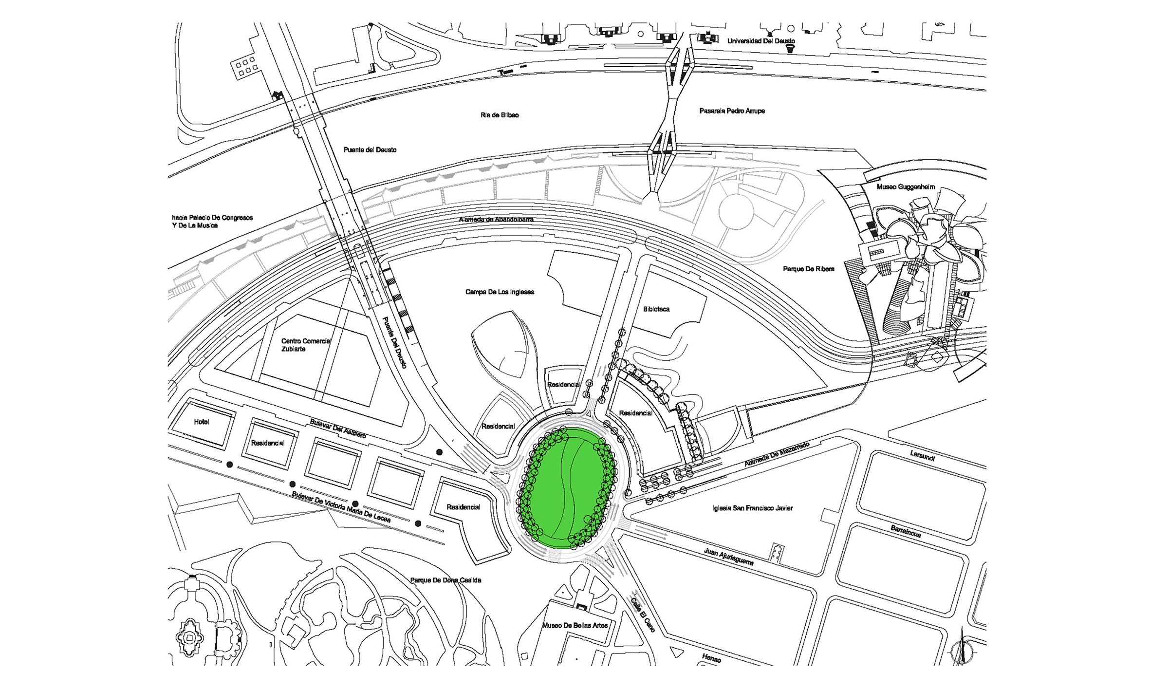 The Plaza, on top of an underground parking garage, emerges as a pivot point that connects the 19th c. neighborhood to the new section of Bilbao, Deusto university campus, the Guggenheim Museum, and the Nervión River.