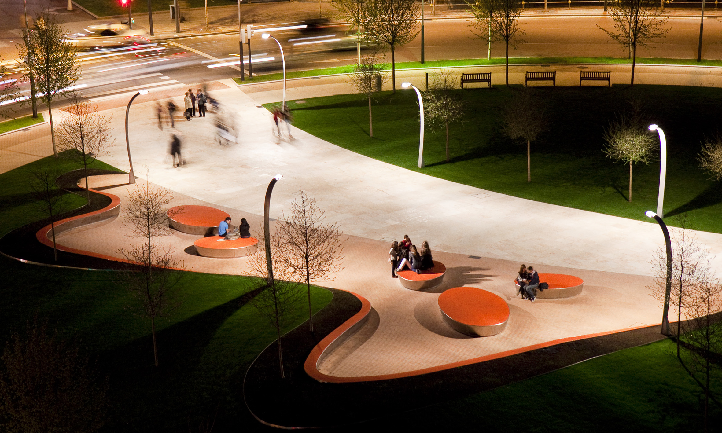 A direct central path focuses the urban movement that spreads through the plaza, while the oval tree-lined perimeter path allows for bicycle circulation. Three “pocket” parks hook onto the sides of the central path and provide colorful and playful seating made from recycled rubber. Each pocket has a different character: an amphitheater section with reflection puddles, an ottoman seating section, and a “garden” section of flowering shrubs and a 100 year old Laegostremia tree at its entrance.