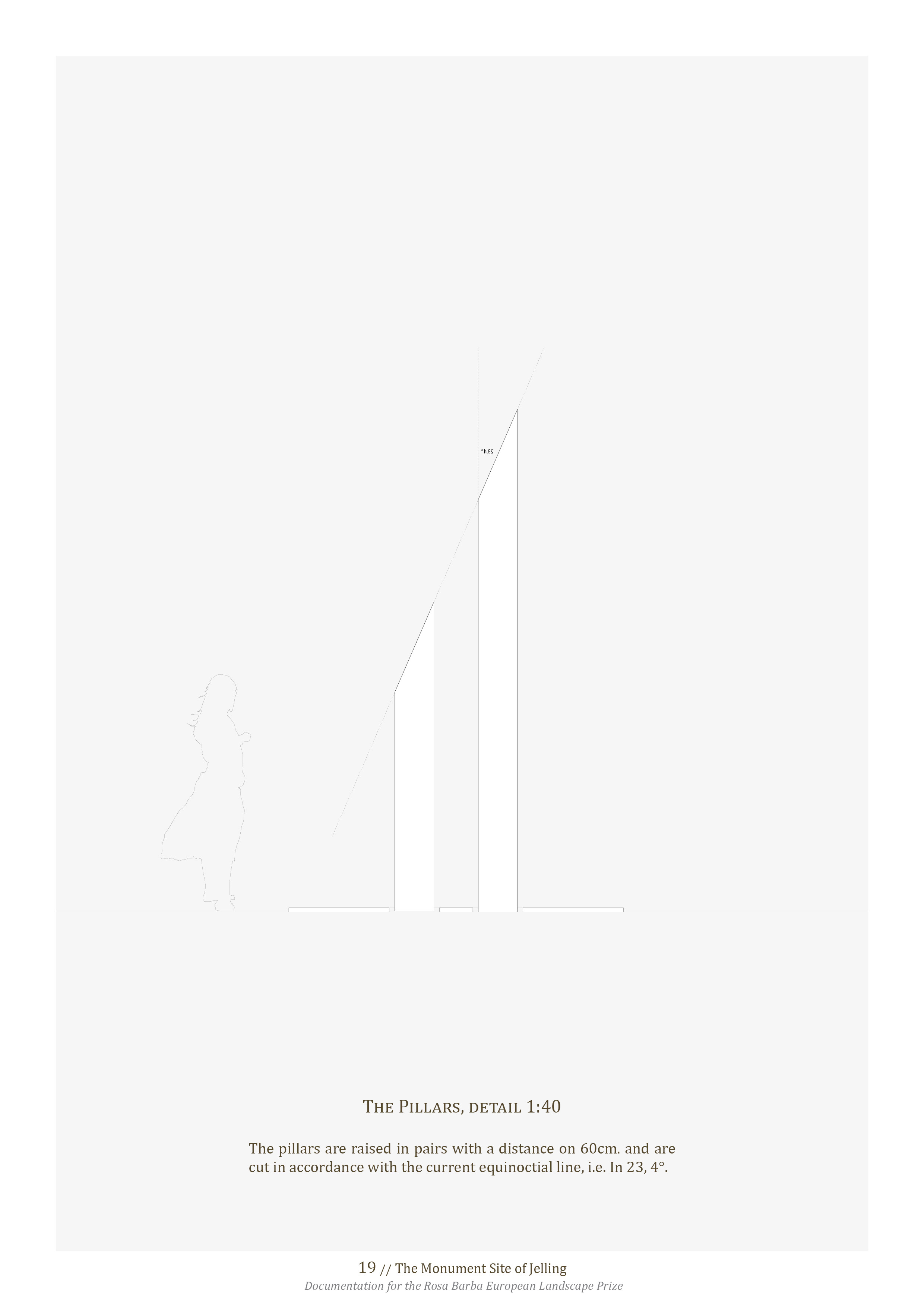 Archaeological excavations indicate that in the time of Harald Bluetooth, a palisade fence was constructed with a floor plan of 360x360 meters. The Palisade that encapsulates the mounds, the Jelling stones, and a number of longhouses and stone ships, was placed as a very accurate parallelogram. Geometric studies show that the different works of Harald Bluetooth, including Aggersborg, Fyrkat and Nordhøjen, can be written into a 60 meter module in this parallelogram. The palisade has in other words been constructed after the same basic principle and from the same measurements as Harald Bluetooth’s other works. The difference is the shape and size, which emphasize the high status of Jelling and its importance in the Viking age. The floor plan of the palisade on 360x360 meters is used to define the new Monument Site. Its scale and geometry are emphasized – where it’s possible – with surfaces and pillars in a light, almost white concrete. The surfaces are being treated in a way so that the initial transverse elements of the palisade fence are being underlined. The pillars are creating an evident space; they outline a significant boundary between the green Monument Site with clusters of heather vegetation and the adjacent cultivated landscape. The pillars are raised in pairs with a distance on 60cm. and are cut in accordance with the current equinoctial line, i.e. In 23, 4°.
