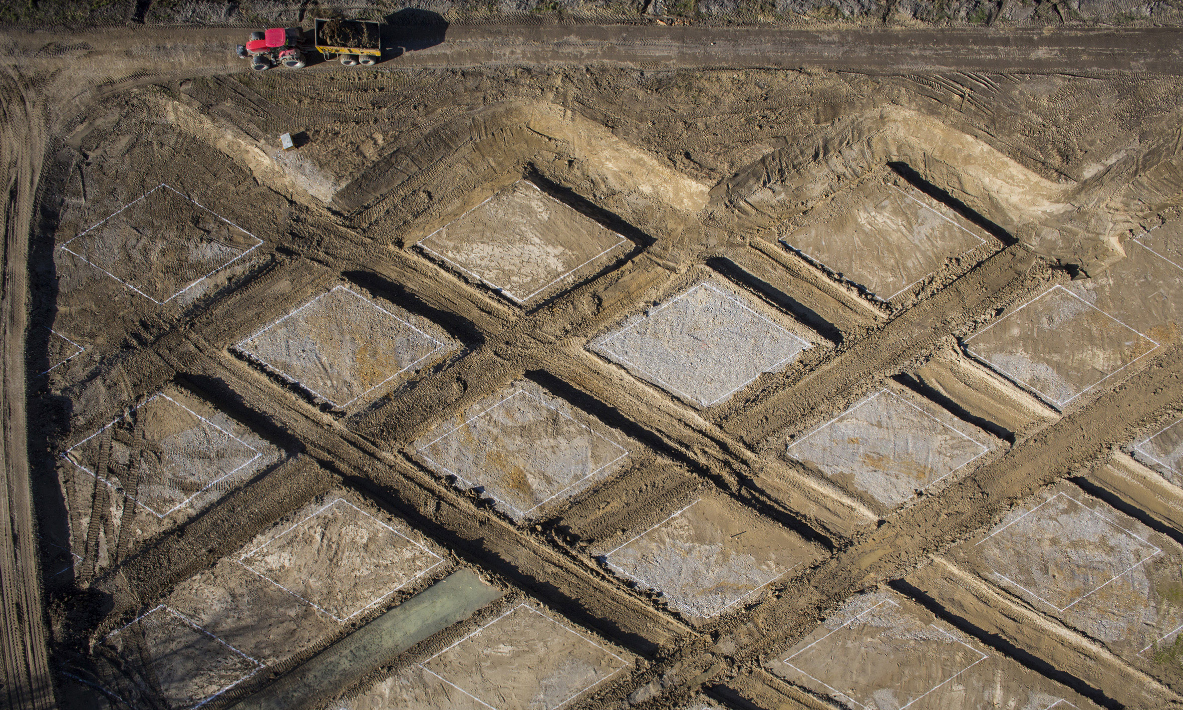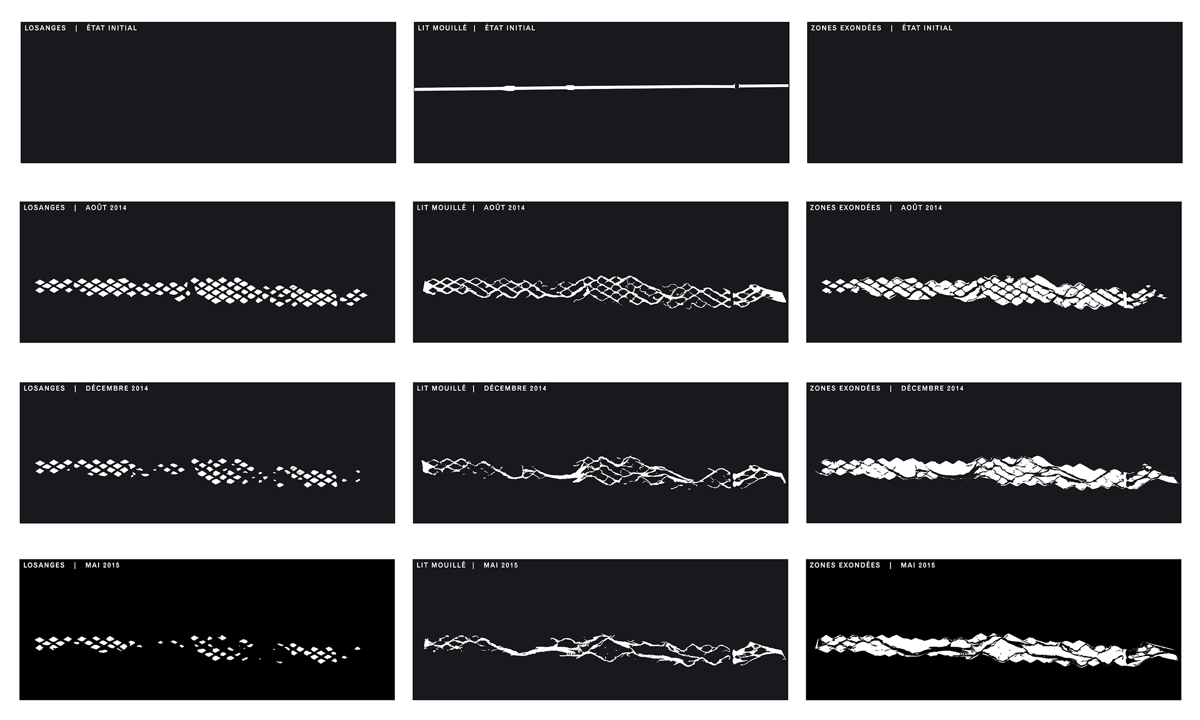 For the drawing of the river - conscious of the useless effort to design a fixed river bed – we proposed a launching pattern whose form addresses the play between the river flow and the prepared terrain. This diamond-shape pattern opens a complex serie of undetermined channels for the flows. The results are beyond our expectations: the river flows, displacing diverse materials, gravels, sand and the geometrical matrix of lozenges is significantly modified. We must accept this paradox: the more defined the grid given to the river, the more the river will be free to design.