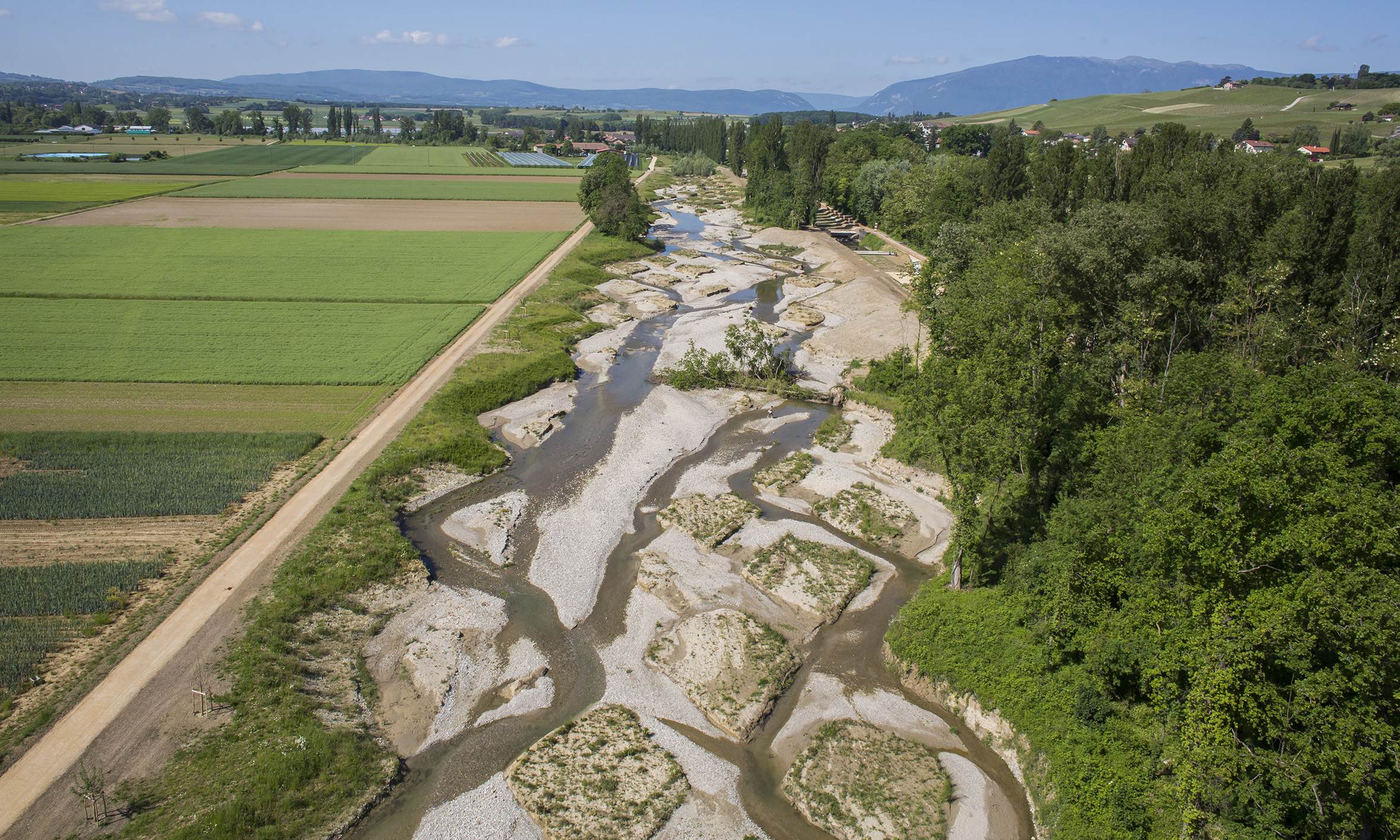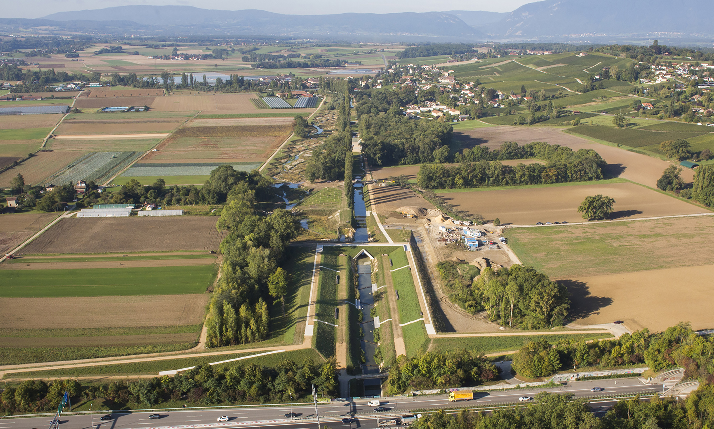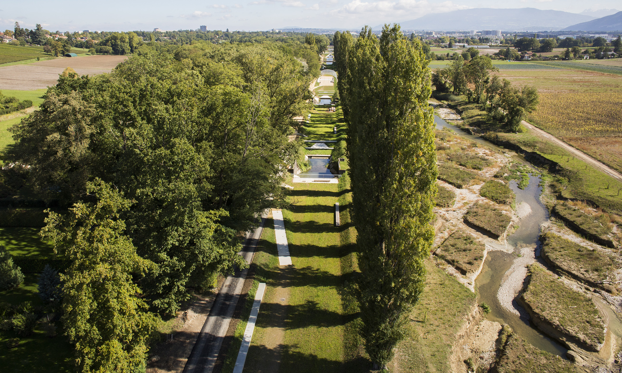The Aire river flows through valleys historically devoted to farming. From late 19th century it was progressively canalized. In 2001 State of Geneva opened a competition with the idea of restoring the river to its original shape by destroying the canal. We instead proposed to combine the canal with a vast divagation space for the river. In the process the canal becomes the pointer for the transformations, a reference line giving the possibility to understand the before and after.