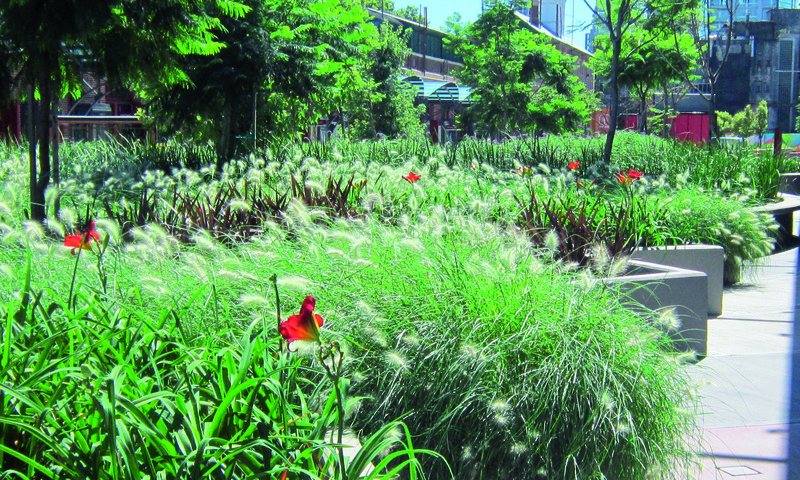 El desnivel de un metro existente entre veredas opuestas determinó que la plantación se concentre en la franja central, generando allí mayor altura para plantar árboles de bajo y mediano porte. Esto enfatiza la linealidad del espacio y despeja el circuito peatonal.